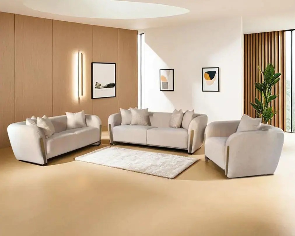 Enhance your living space with the timeless elegance of this Modern Beige 4-Piece Sofa Set. Designed to bring both style and comfort, this set includes a spacious three-seater sofa, a cozy loveseat, a sleek accent chair, and a matching ottoman. The neutral beige upholstery, crafted from premium-quality fabric, effortlessly complements any interior decor, adding warmth and sophistication to your home.